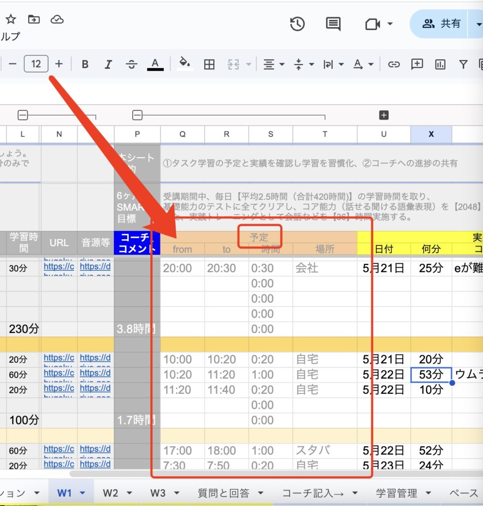 コーチングセッション(CS)が終わったら、すぐにパーソナル学習プラン「W○」シートのQ〜T列(各タスクを「何時に?」「どこでやるか」)をすべて入力し、次のセッションまでの学習予定を具体的に決めておきましょう。