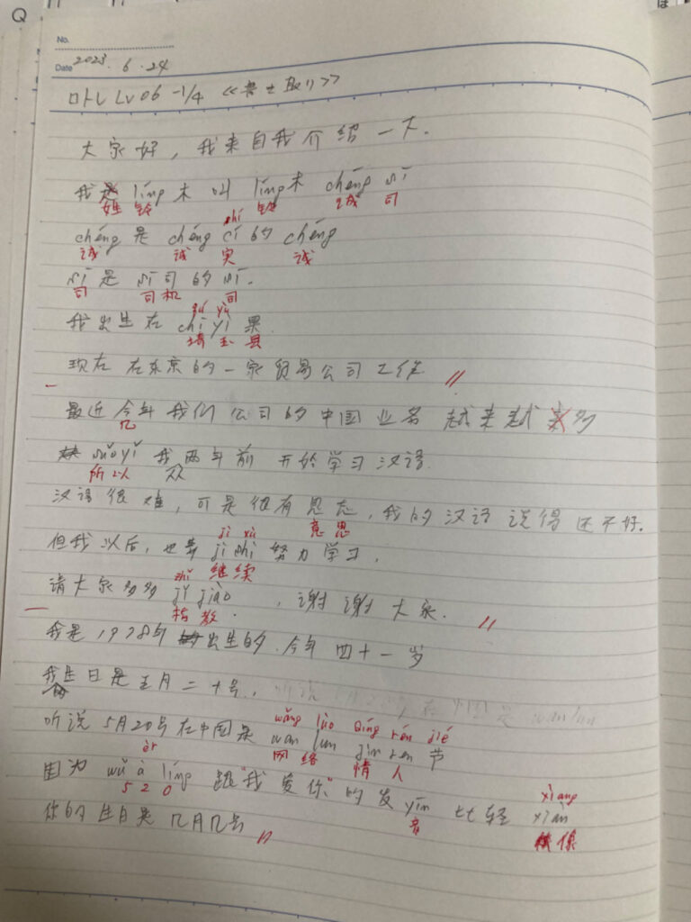 最初の1回目(「口トレLv06-1/4」)はこの68秒の音源を、タスク学習時間(30分or60分)の間、集中して聴き、書き取ります。 漢字で書けるところは、漢字を書き、漢字がわからないところは、ピンイン(母音、子音、声調の3つ)を書きます。自信がないところも何かしらのピンインを推測して書きましょう。空白がないようにしてください。